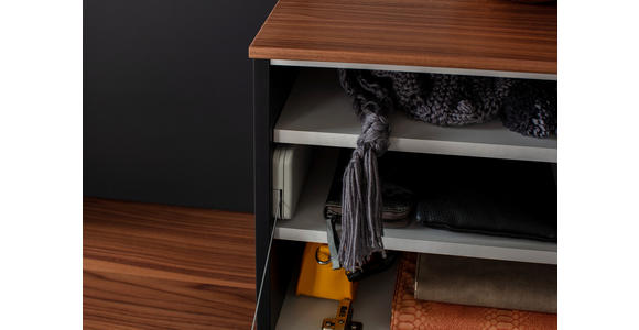 Ästhetische Anmut versprüht diese CASSANDO Garderobe (4-teilig) in Anthrazit und Nussbaumfarben in Ihrem Eingangsbereich. Das geradlinige Design der Möbel mit den dazu passenden Details aus Metall in Schwarz lenkt den Fokus auf das Wesentliche und gibt ein klares Statement im Hinblick auf ein einladendes Einrichtungskonzept am Puls der Zeit ab. Dunkelgrau und Nussbaumfarben kreieren zusammen einen aparten Look mit natürlichem Akzent.